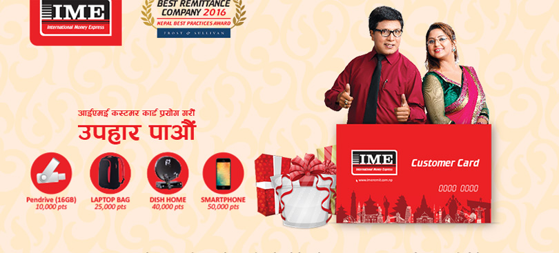 काठमाडौं । रेमिटेन्स कम्पनी आईएमईले कस्टमर कार्डमा बोनस अङ्कसहित निश्चित उपहारको व्यवस्था गरेको जनाएको छ ।