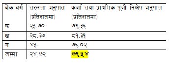 बैंक वर्ग तरलता अनुपात (प्रतिशतमा) कर्जा तथा प्राथमिक पूंजी निक्षेप अनुपात (प्रतिशतमा)