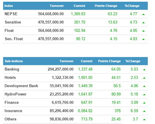कारोबार बन्द हुँदा नेप्से परिसुचक ६३.२३ अंकले बढेर १३८९.८३ अंकमा नेप्से अडेको हो ।