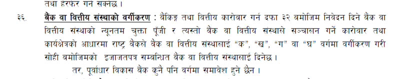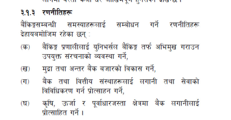 संसदबाट पारित भएको तर प्रमाणिकरण नभैसकेको बाफिया बिधयेकमा बैंकलाई सहायक कम्पनी खोलेर लघुवित्त र मर्चेन्ट बैंकिङ कारोबार मात्र गर्न दिने भनिएको छ । तर बित्तीय क्षेत्र बिकास रणनीति (एफएसडिएस) मा बैंकको ब्याज आम्दानी घटाउने अन्य सेवा तथा कार्यमा प्रेरित गर्न भनिएको छ ।