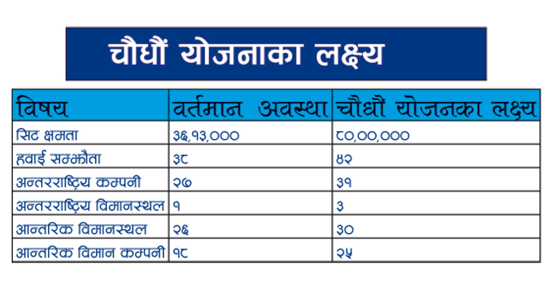 चौधौं योजनाको लक्ष्यमा आन्तरिक उडान गर्ने वायुसेवाहरूको संख्या १८ बाट २५ पुर्याउने लक्ष्यसमेत राखिएको छ । नेपाल आउने विदेशी बिमान कम्पनीहरुको संख्या २७ बाट ३१ पुर्याउने लक्ष्य समेत राखिएको छ । चौधौं योजनामा द्विपक्षीय हवाई सेवा सम्झौता भएका देशहरुको संख्या ३८ बाट ४२ पुगेको पुग्ने लक्ष्य राखिएकोे छ ।