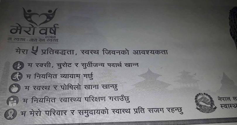 स्वास्थ्य मन्त्रालयले भोलीदेखि मेरो वर्ष २०७४ म स्वस्थ र मेरो देश स्वस्थ अभियान सुरुवात गर्दै छ । जसमा स्वस्थ रहनको लागि ५ प्रतिबद्धता राखिएका छन् ।