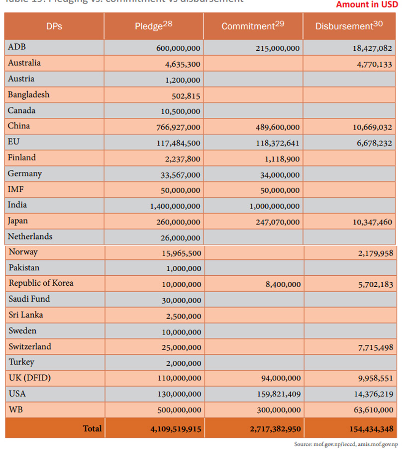 अर्थमन्त्रालयका अनुसार पुननिर्माणपछि सहयोग गर्ने घोषणा गरेका दातृ निकायबाट २ खर्ब ७१ अर्ब रुपैयाँको सहयोग आउने प्रतिबद्धता आएको छ । जसमा सरकारले १ खर्ब ५४ अर्ब पुननिर्माणको लागि दातृ. निकायबाट लिएको छ । तर,पुननिर्माणको लागि पैसा लिएपनि खर्च अनुसारको काम भने भएको छैन ।