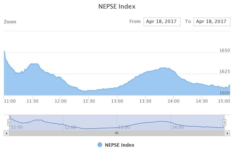 मंगलबार नेप्से ३९.५७ अंकले घटेर १६१२.०४ अंकमा आइपुगेको छ । आइतबार पनि नेप्से ४५ अंकले घटेको थियो । ०७३ सालको कारोबारको अन्तिम दिन नेप्से परिसूचक १६९७ मा अडेको थियो ।