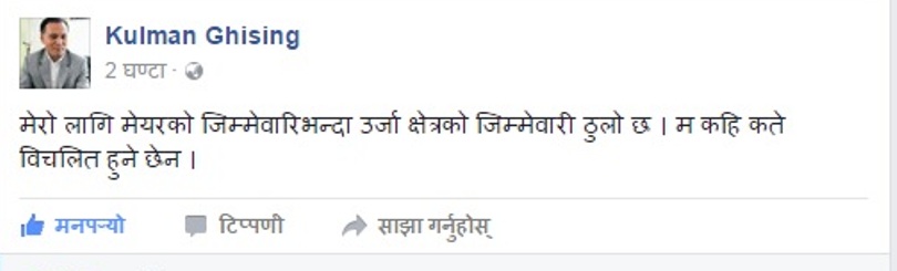 काठमाडौं सहित देशभर लोडिसेडिङ अन्त्य गरेर चर्चामा आएका प्राधिकरण प्रमुख घिसिङले काठमाडौंको मेयर बन्न अस्विकार गरेका हुन् । आफ्नो फेसबुकमा स्टाटस लेख्दै घिसिङले काठमाडौंको मेयरभन्दा आफु ऊर्जामै ठिक रहेको बताएका छन् ।
