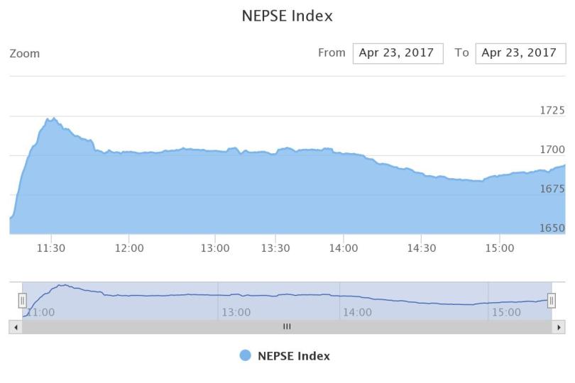 कारोबार शुरु हुने बित्तिकै नेप्सेमा उछाल आएको थियो । कारोबार शुरु भएको १० मिनेटमै नेप्से परिसूचक ३ प्रतिशतले बढ्दा सर्किट ब्रेक समेत लागेको थियो । झण्डै ६२ अंकले बढेको नेप्से अन्तत थोरै सम्हालिंदै ३५ अंकले बढ्दा १ अर्ब ५३ करोड रुपैंयाँको कारोबार भएको छ ।