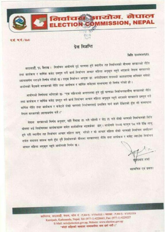 आयोगका प्रमुख निर्वाचन आयुक्त अयोधीप्रसाद यादवले केही दिन अगाडि नयाँ कार्यक्रमबिनाको बजेट ल्याउन पाइने बताएका थिए । यादवको भनाईमा प्रमुख प्रतिपक्षी दल नेकपा एमालेले आपत्ती जनाएको थियो । आयोगको शनिवारको विज्ञप्तीले निर्वाचन हुने भए बीचमा बजेट ल्याउन रोकिएको छ ।