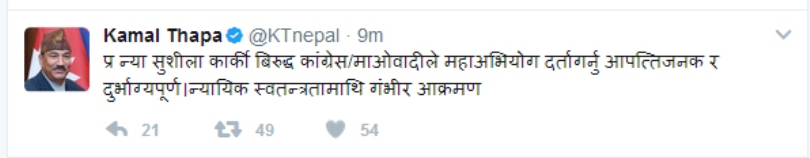 कमल थापाले सामाजिक संजाल ट्इिटरमा टुईट गर्दै सरकारका दुई साझेदारले गरेको महाअभियोग प्रस्तावको विरोध गरेका हुन् । उनले महाअभियोग प्रस्ताव न्यायिक स्वतन्त्रतामा गम्भिर आक्रमण भएको बताएका छन् । महाअभियोग संसद्बाट पारित गर्न दुई तिहाई चाहिन्छ ।
