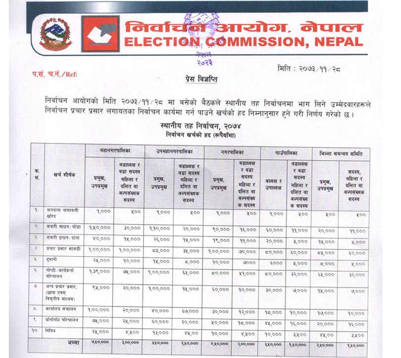 निर्वाचन आयोगले स्थानीय तह निर्वाचनमा उठेका उम्मेद्वारलाई खर्चमा सिमा तोकेको छ । आयोगका अनुसार महानगरपालिकामा मेयर उम्मेद्वारले विभिन्न शिर्षकमा गरेर बढीमा साढे ७ लाख रुपैयाँ खर्च गर्न पाउँछन् । यस्तै उपमहानगर पालिकामा ६ लाख, नगरपालिकामा ५ लाख र गाउँपालिकामा साढे ४ लाख खर्च गर्न पाउँने व्यवस्था छ । उपमेयर तथा गाउँपालिकाका उप्रमुखलाई पनि खर्च पाउने व्यवस्था बराबर हो ।