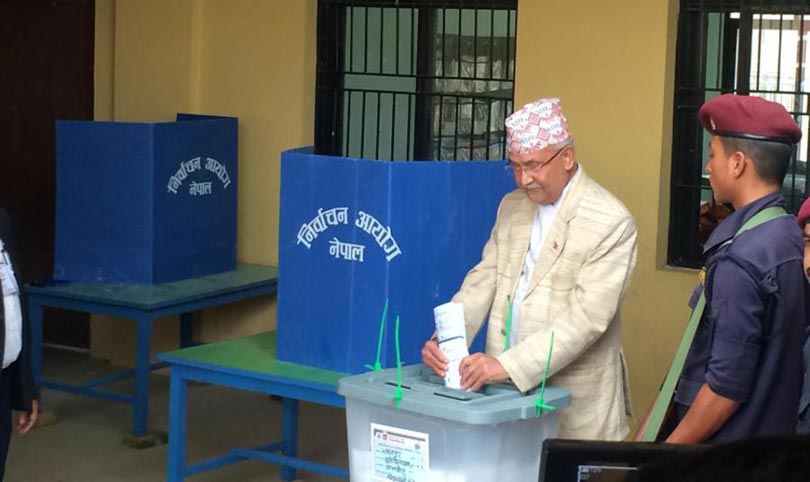 काठमाडौं । एमाले अध्यक्ष केपी शर्मा ओलीले स्थानीय तह निर्वाचनमा मतदान गरेका छन् । २० बर्षपछि हुन लागेको स्थानीय निर्वाचनमा एमाले अध्यक्ष ओलीले आइतबार बिहान मतदान गरेका हुन् ।