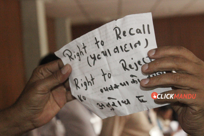 काठमाडौं । मतदान भएको १९ घण्टापछि सुरु भएको काठमाडौं महानगरको मतपेटिकामा अनौठो कागज फेला परेको छ । सर्बदलीय सहमति पछि सोमबार १२ बजेपछि मात्रै सुरु हुन लागेको मतगणनामा ‘राइट टू रिजेक्ट’ र ‘राइट टू रिकल’ लेखिएको कागजात फेला परेको हो ।