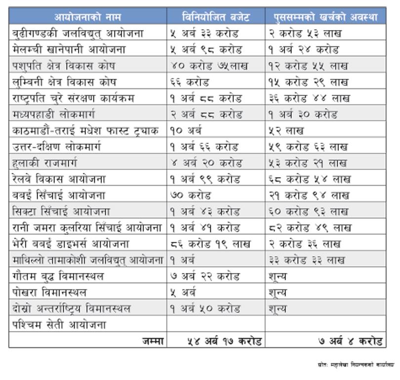 यद्यपि, आर्थिक वर्षको पहिलो ६ महिना सकिँदा ७ अर्ब रुपैयाँमात्रै खर्च भएको छ । ‘राष्ट्रिय गौरवका आयोजनामा भएको अहिलेसम्मको खर्चको अवस्थालाई हेर्दा सन्तोष मान्ने अवस्था छैन, कामलाई तीव्रता दिएर छिटो खर्च गर्नुपर्छ भनेर हामी लागेका छौं, यो वर्ष केही सफलता मिल्छ कि भन्ने अपेक्षा छ,’ अर्थसचिब डा. शान्तराज सुबेदीले भने ।