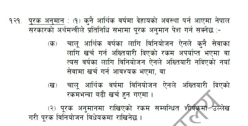 संविधानको धारा १२१ मा पुरक बजेट ल्याउने ब्यवस्था छ । त्यहाँ पहिलाका बजेटमा ल्याइएका कार्यक्रम हटाउन पाइने र नयाँ कार्यक्रम थप गर्न पाइने भनिएको छ । त्यसैमा टेकेर पुरक बजेट ल्याउँदा यो रडाको पनि हुदैन र बजेट पनि समयमै आउछ । कुनै शंका वा संसय बाँकी भए संविधान पढे हुन्छ ।