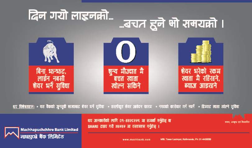 काठमाडौं । धितोपत्रको सार्वजनिकनिस्काशनमा (आई पिओ/एफपिओ) आवेदनदिँदा माछापुच्छ्रे बैंकले आफ्नाग्राहकहरुलाई निःशुल्कआस्वा सेवा((सेयर भर्ने )प्रदानगर्ने बताएको छ । उक्त बैकमा चल्ती, बचत तथा कल खाता भएका ग्राहकहरुले निःशुल्क आस्वा सेवामार्फत सहज, सरल र सुरक्षित तवरले लगानी गर्न सक्ने छन् ।