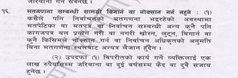 ‘दफा १६ले मतपत्र च्यात्नेलाई दुई वर्ष कैद वा एक लाख रुपैयाँ जरिबाना वा दुवै सजाय हुन सक्ने’ उल्लेख गरेको छ ।