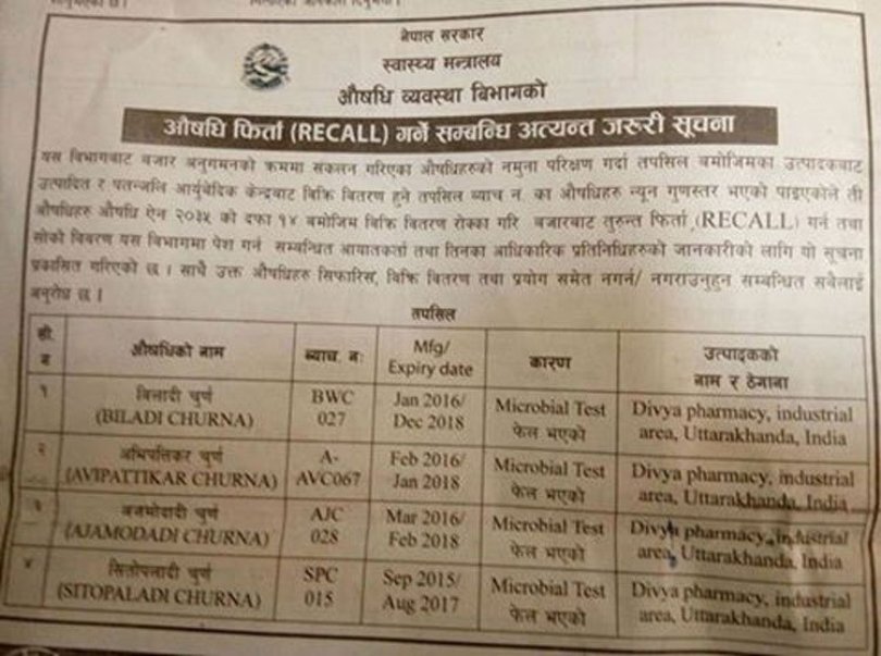 रामदेवकोे कम्पनी दिब्या फार्मेसीले उत्पादन गर्ने औषधी औषधी व्यवस्था विभागले बजार अनुगमन गर्दा न्यून गुणस्तरको पाइएको हुँदा औषधी फिर्ता गर्न निर्देशन दिएको छ ।