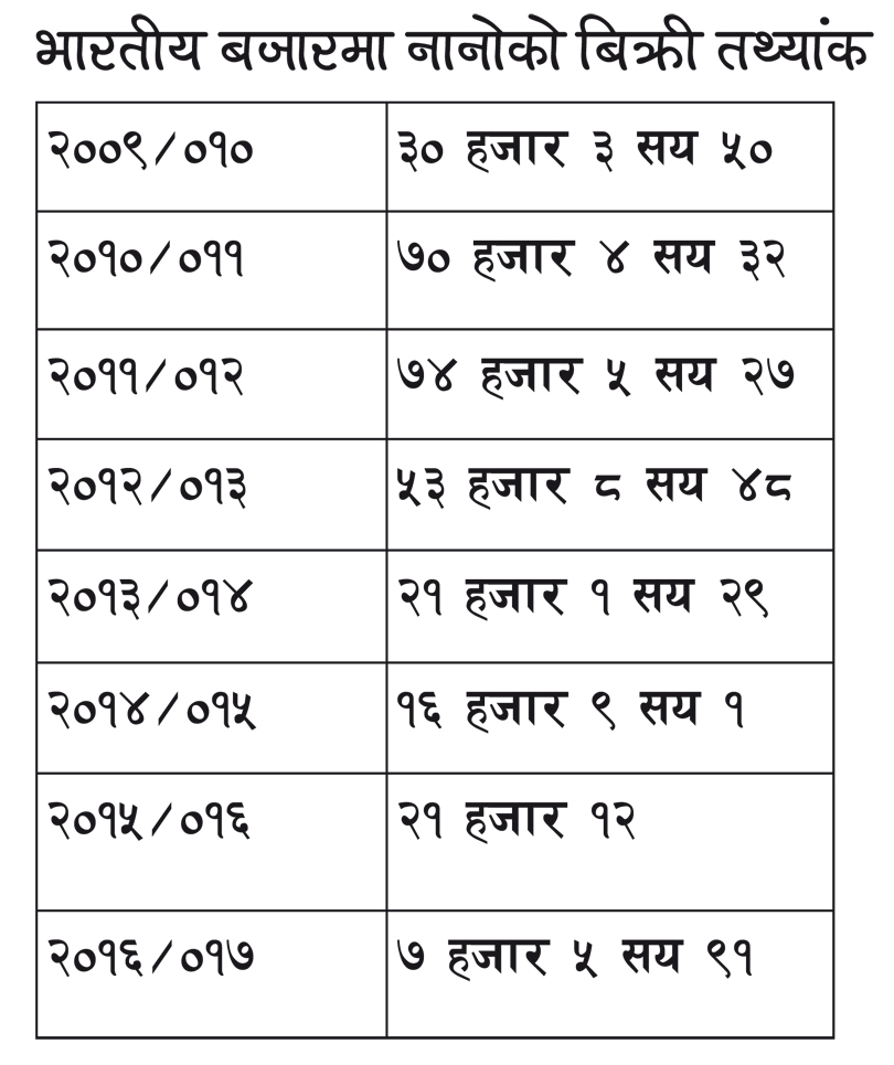 सन् २०११ देखि २०१३ को अवधिमा टाटाको समग्र प्यासेन्जर कार बिक्रीमा नानोले पाँचौं स्थान ओगट्न सफल भएको थियो । त्यसयताका वर्षहरुमा भने नानोको बिक्री क्रमिक रुपमा ओरालो लागेको तथ्यांकले देखाउँछ । सस्तोमा कार चढ्न पाइएको भए पनि उपभोक्तामा नानो कारले किन विश्वास जमाउन सकेन भन्ने प्रश्न उब्जिएको छ ।