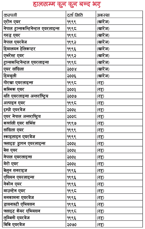 नेपालमा वायुसेवा चलाउन खोज्ने तथा कम्पनी दर्ता गर्ने धेरै व्यवसायी भए पनि सिमित मात्रै व्यवसायी सफल भएका छन् ।