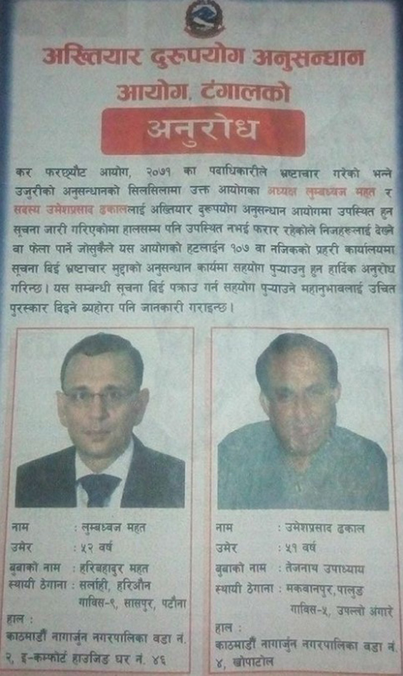 अख्तियारले सार्वजनिक सूचना जारी गर्दै आयोगले बयानलाई बोलाउदा महत र ढकाल अनुपस्थित रहेको हालसम्म फरार रहेको भन्दै पक्राउ गर्न सहयोग गर्नेलाई पुरस्कार दिने जनाएको छ ।