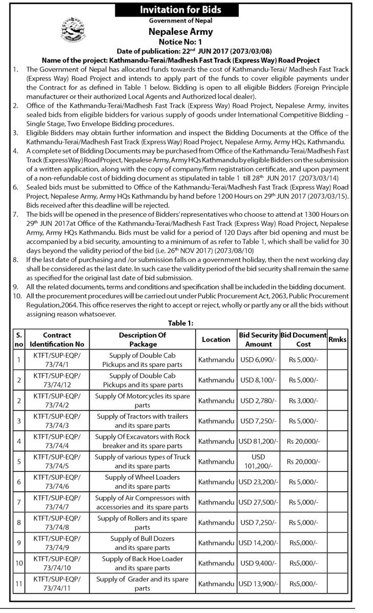 निर्माणकार्य अगाडी बढाउन आवस्यक पर्ने रक ब्रेकरसहितको एक्जाभेटर, ट्रक, व्हील लोडर, एयर कम्प्रेशर, रोलर, बुल डोजर, ब्याकहोलोडर, डबल क्याव पिकअप, मोटरसाइकल, ट्रेलरसहितको ट्याक्टर र ग्रेडर आपूर्तिको लागि टेन्डर आब्हान गरेको छ।