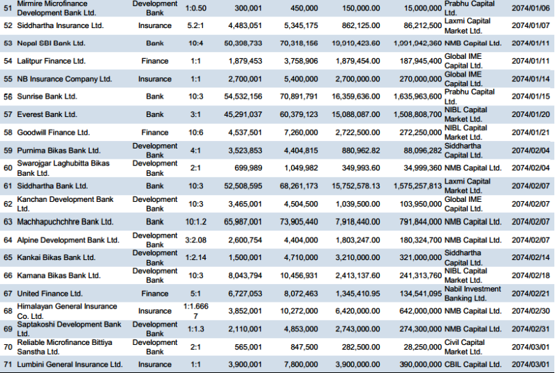यसैगरी स्वरोजगार लघुबित्तको ५० प्रतिशत हकप्रद साउन ४, मिर्मिरे माइक्रोफाइनान्सको ५० प्रतिशत साउन ८, एनबी इन्स्योरेन्सको १०० प्रतिशत साउन ९, कामना बिकास बैंकको ३० प्रतिशत साउन १५, गुडविल फाइनान्सको ६० प्रतिशत साउन २२, एभरेष्ट बैंकको ३३.३३ प्रतिशत साउन २२, पूर्णिमा विकास बैंकको २५ प्रतिशत साउन २२, अल्पाइन विकास बैंकको ३ः२.०८ अनुपातमा साउन २९ र रिलायबल माइक्रोफाइनान्सको ५० प्रतिशत हकप्रद साउन २९ गते बन्द हुँदैछन् ।