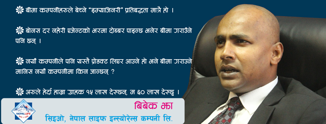 नेपाली बीमा बजारको अबस्था, अबको चुनौति र अबसर तथा संभावना जस्ता समसामयिक बिषयमा नेपाल लाइफ इन्स्योरेन्सका प्रमुख कार्यकारी अधिकृत (सिईओ) बिबेक झासँग क्लिकमाण्डुले गरेको कुराकानीको सम्पादीत अंशः