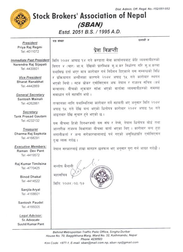 एशोसियनले विज्ञप्ती जारी गर्दै सेयर ब्रोक्रर कमिसनमा लाग्ने मुल्य अभिबृद्धि कर(भ्याट)को विषयमा अर्थमन्त्रालयसँग सहमति भएको भन्दै आइतबारदेखि कारोबार खुल्ने बताएको हो ।