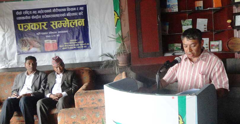 काठमाडौं । आर्थिक समृद्धिका लागि व्यावसायिक मौरीपालन भन्ने नाराका साथ राजधानीमा जारी राष्ट्रिय मह महोत्सव मह किसान तथा व्यवसायीले बहिस्कार गरेका छन् । आयोजकले एक पक्षलाई मात्रै मेलामा समेटेको बहुसंख्यक मह किसान तथा मह व्यवसायीलाई वेवास्ता गरेको भन्दै उनीहरुले बहिस्कार गरेका हुन् । नेपाल मौरीपालक किसान महासंघ, मौरीपालन केन्द्रीय सहकारी संघ र नेपाल केन्द्रीय मह व्यवसायी संघले बुधबार राजधानीमा सयुक्तरुपमा पत्रकार सम्मेलन गरी महमेला बहिस्कारको घोषणा गरेका हुन् ।
