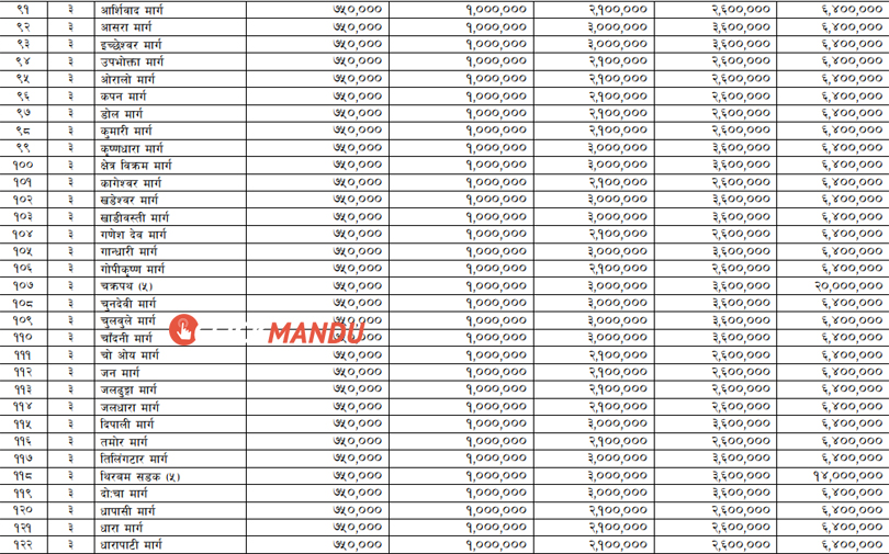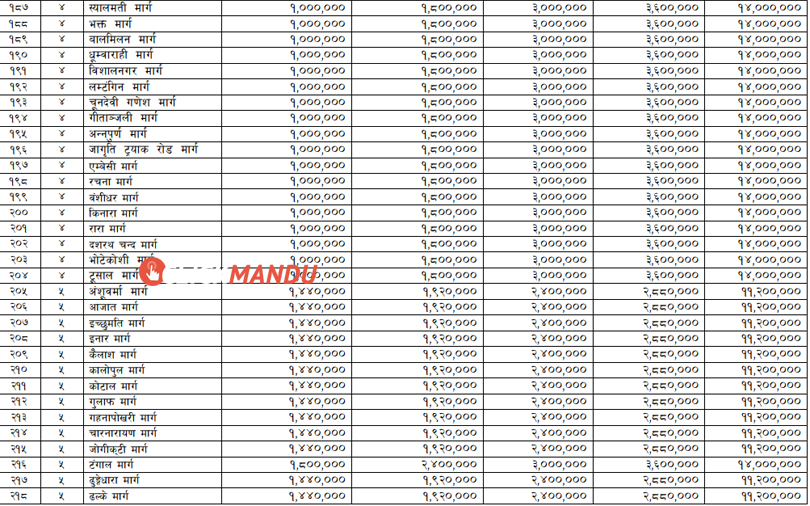 महानगरपालिकाले काठमाडौंको मुटु मानिने दरबारमार्गमा रोपनीको २ करोड ५० लाख रुपैयाँ मूल्य तोकेको छ । जबकी दरबारमार्गमा आनाकै १ करोड रुपैयाँमा पनि जग्गा किन्न पाइँदैन ।
