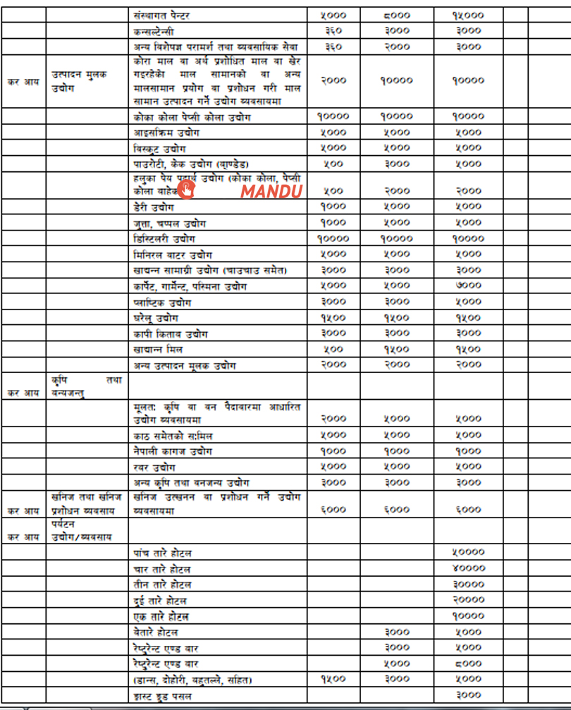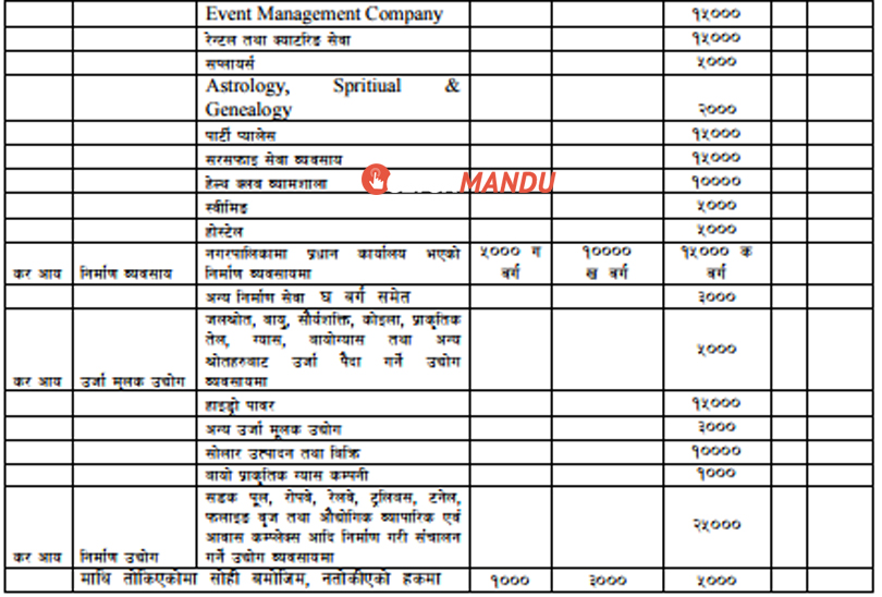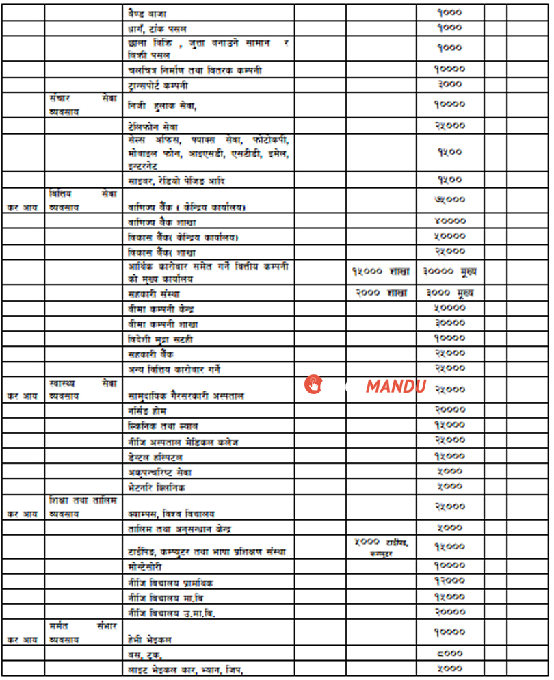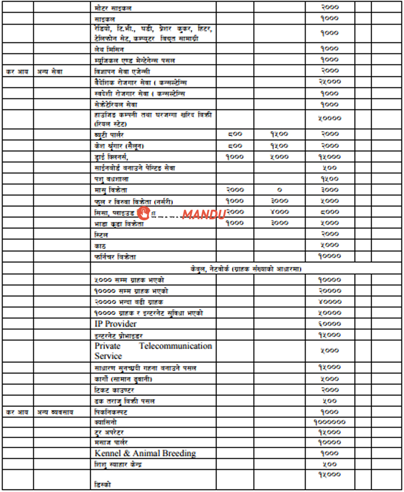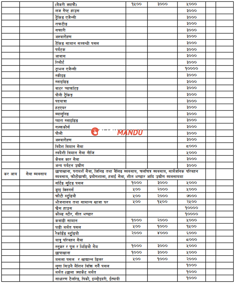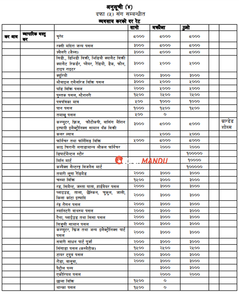 महानगरले काठमाडौंमा हुने सबै प्रकारका व्यवसायमा कर लगाएको छ । हेर्नुहोस् सूचि