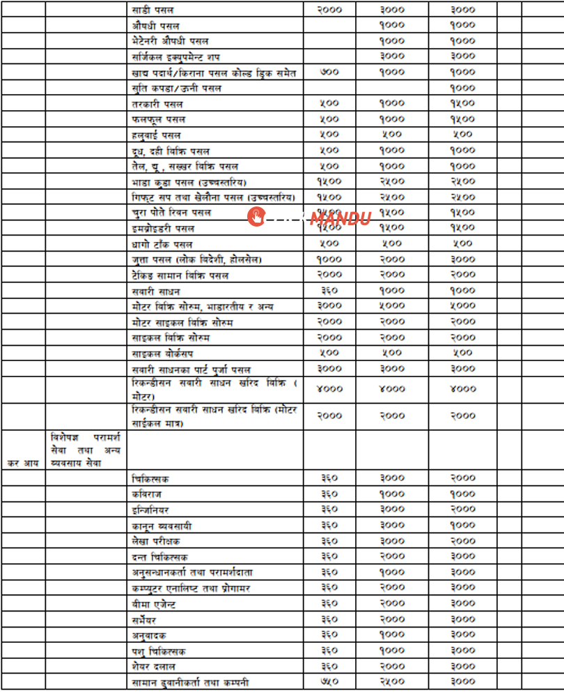 काठमाडौंमा व्यवसाय गर्दा सबैभन्दा कम तिर्ने व्यवसायमा हलुवाई पसल,धागो र साइकल वर्कपप,तरकारी पसल,फलफुल रहेका छन् । व्यवसायबाट महानगरले वर्षमा ५ सय रुपैयाँ लिने छ ।