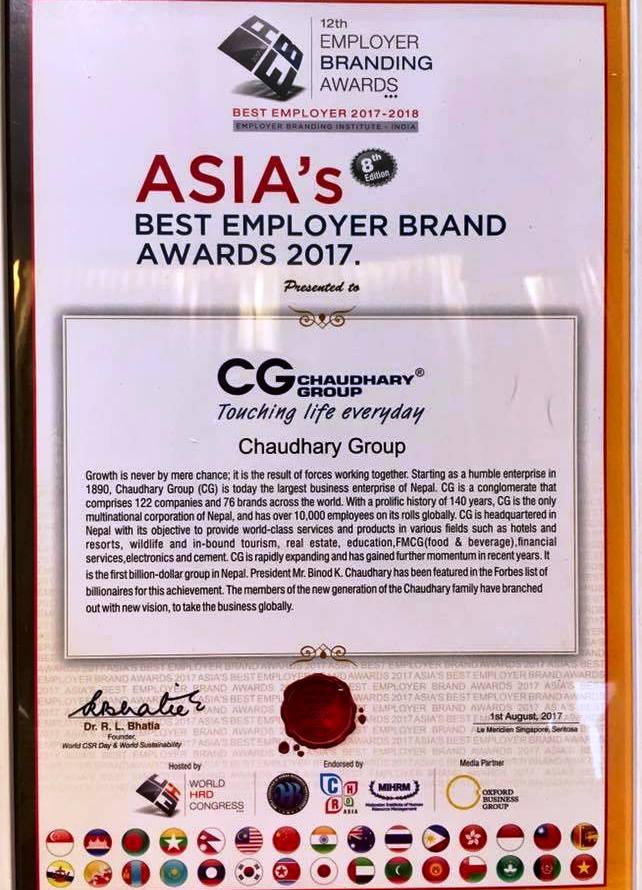 सिंगापुरको ले-मेरिडियनमा मंगलबार वल्र्ड एचआरडी कंग्रेस एण्ड इम्प्लोयर ब्रान्डिङ इन्सटिच्युटद्वारा आयोजित कार्यक्रममा गु्रपलाई उक्त अवार्ड प्रदान गरिएको हो ।