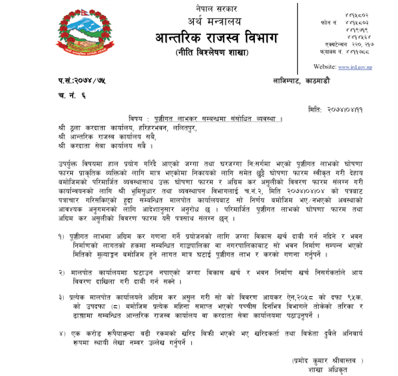 विभागले साउन ११ गते मातहतका कर कार्यालयहरुलाई पत्र पठाउँदै व्यक्तिगत तहबाट हुने व्यवसायिक घरजग्गा कारोबारमा पुँजीगत लाभकर असुलीलाई कडाई गर्ने ब्यवस्था गरिएको देखिएको छ ।