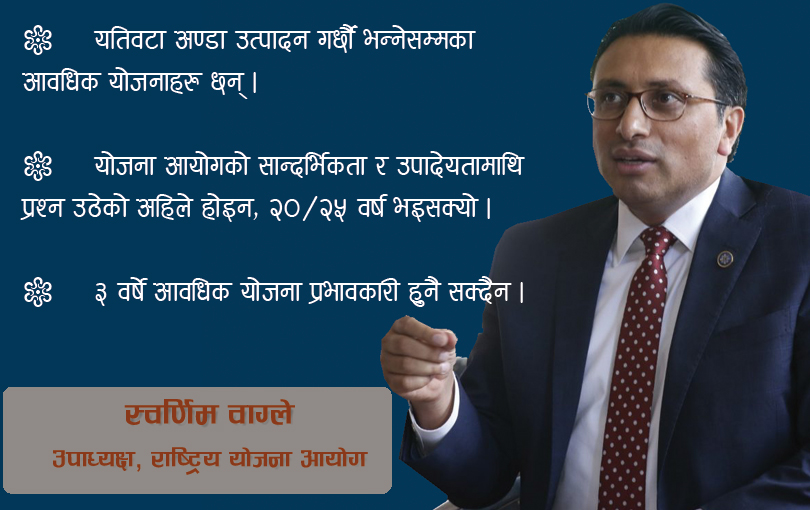 त्यस्तो मात्रै पनि होइन । आवधिक योजना रहन पनि सक्छ । त्योभन्दा पनि महत्वपूर्ण विषय चाही दीर्घकालिन खाका नै हो । जस्तो दीगो विकासको लक्ष्य छ । सन् २०२२ मा हामी मध्यमआयस्तरमा स्तरोन्नति हुने भनेका छौं । अर्काे कुरा मध्यम आयमा पुग्ने भनेका छौं । आवधिक योजनाले यस्ता कार्यक्रमको लागि केही पनि गर्न सक्दैन । त्यो लक्ष्यामा पुग्नको लागि तोकिएको समयसम्मको स्रोतको अनुमान गर्न सक्नु पर्यो । आर्थिक बृद्धिको प्लान ए, प्लान बी, प्लान सी अथवा सिनारियो ए, सिनारियो बी वा सिनारियो सी हुनुपर्यो । यो यो आर्थिक बृद्धि भयो, यस्तो रिफर्म भयो भने यस्तो अबस्थामा पुग्छौं । भएन अहिलेकै अबस्था रह्यो भने यस्तो हुन्छ । र, अहिलेको भन्दा पनि बिग्रियो भने यस्तो हुन्छ भनेर भन्न सक्नु पर्यो ।