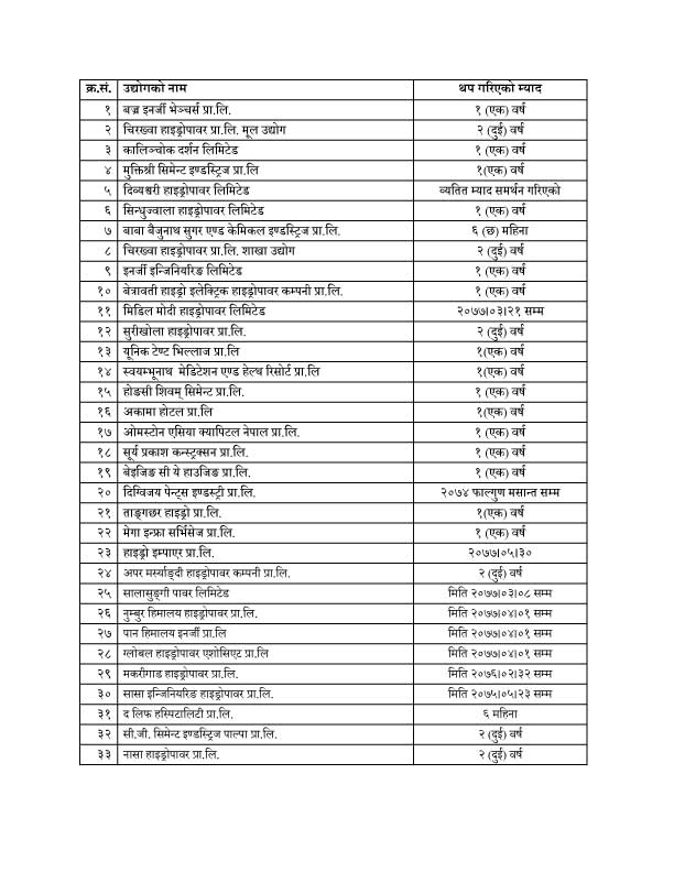 म्याद थप गराउने जलविद्युत कम्पनीहरुमा बज्र इनर्जी भेञ्चर्स प्रालि, चिरख्वा हाइड्रोपावर प्रालि मूल उद्योग, दिव्यश्वरी हाइड्रोपावर लिमिटेड, सिन्धुज्वाला हाइड्रोपावर लिमिटेड, चिरख्वा हाइड्रोपावर प्रालि शाखा उद्योग, इनर्जी इन्जिनियरिङ लिमिटेड, बेत्रावती हाइड्रो इलेक्ट्रिक हाइड्रोपावर कम्पनी प्रालि, मिडिल मोदी हाइड्रोपावर लिमिटेड, सुरीखोला हाइड्रोपावर प्रालि, ताङ्गछर हाइड्रो प्रालि, हाइड्रो इम्पाएर प्रालि, अपर मस्र्याङ्दी हाइड्रोपावर कम्पनी प्रालि, सालासुङ्गी पावर लिमिटेड, नुम्बुर हिमालय हाइड्रोपावर प्रालि, पान हिमालय इनर्जी प्रालि, ग्लोबल हाइड्रोपावर एशोसिएट प्रालि, मकरीगाड हाइड्रोपावर प्रालि, सासा इन्जिनियरिङ हाइड्रोपावर प्रालि र नासा हाइड्रोपावर प्रालि रहेका छन् ।