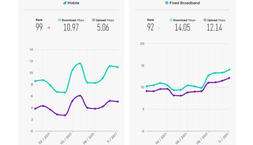 ओक्लाकाअनुसार नेपाल मोबाइल स्पीडको आधारमा हेर्दा ९९ औं स्थानमा रहेको छ । स्पीडटेस्टकाअनुसार नेपालको नोभेम्बर महिनाको मोबाइल स्पीडटेस्ट अघिल्लो महिनाको तुलनामा ६ स्थान तल झरेको हो ।