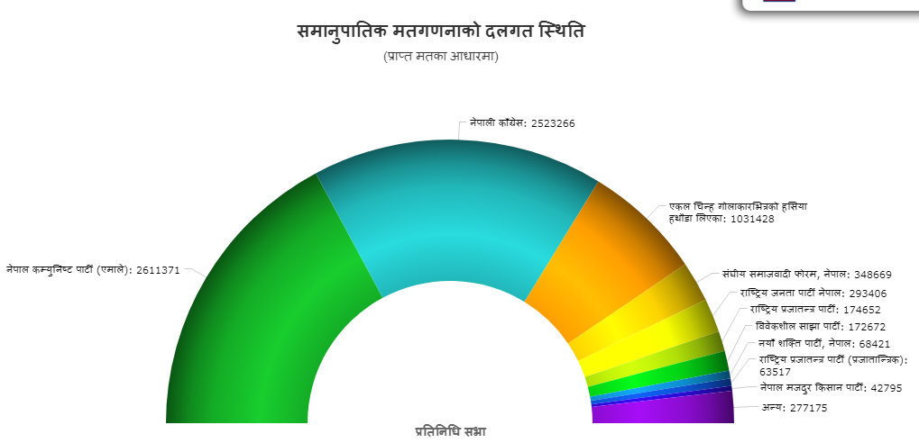 निर्वाचन आयोगका अनुसार एमालेले अहिलेसम्म करिब ८७ हजार मतले अग्रता कायम गरेको छ । मतगणना सुरुभएको केहि घण्टापछि नै एमालेले अग्रता बनाएको थियो ।