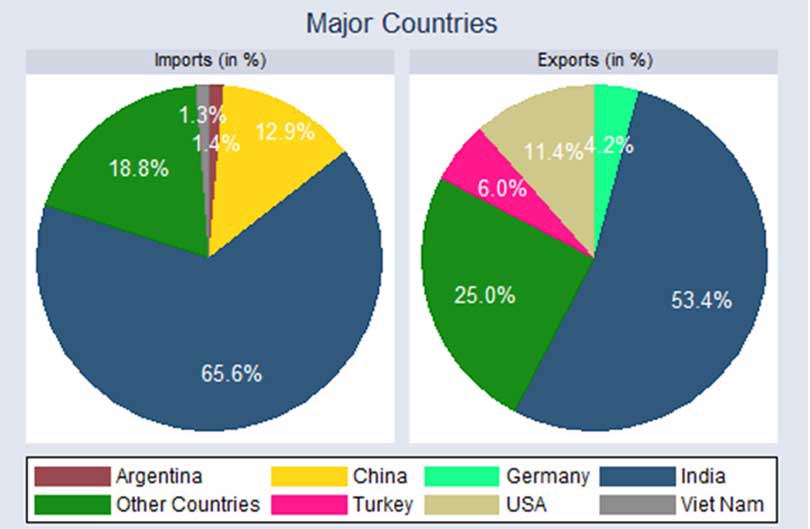 त्यसैगरि निर्यात व्यापारमा पनि छिमेकी मुलुक भारतको हिस्सा सबैभन्दा धेरै अर्थात ५३.४ प्रतिशत रहेको छ । निर्यातमा अन्य मुलुकहरुको हिस्सा २५ प्रतिशत रहेको छ भने अमेरिकाले ११.४ प्रतिशतको हिस्सा ओगटेको देखिन्छ । नेपालको निर्यात व्यापारमा टर्कीको हिस्सा ६ प्रतिशत रहेको छ भने जर्मनीसँग २ प्रतिशत निर्यात व्यापार हुने गरेको देखिन्छ । नेपालको अर्को छिमेकी मुलुक चीनको नेपालको निर्यात व्यापारमा हिस्सा अत्यन्त्य न्यून रहेको भन्सार विभागको भनाई छ ।