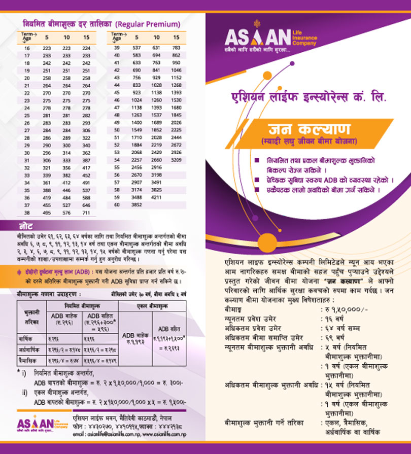 काठमाडौं । एशियन लाईफ इन्स्योरेन्समा दैनिक १ रुपैयाँभन्दा कम बचतमा जीवन बीमा गर्न सकिने भएको छ । इन्स्योरेन्सले कम आय श्रोत भएका व्यक्तिहरुलाई लक्षितगरिे ‘जन कल्याण’ (म्यादी जीवन बीमा योजना) सुरु गरेको हो ।