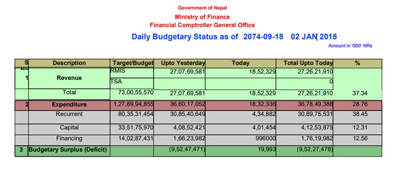 पुस १८ गतेसम्ममा सरकारले ३ खर्ब रुपैयाँ खर्च गरेको छ । पुँजीगत तर्फ ४१ अर्ब तथा वित्तीय व्यवस्था ऋण तिर्नको लागि १७ अर्ब रुपैयाँ खर्च गरेको छ ।