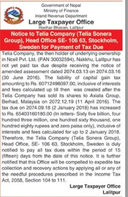 ठूला करदाता कार्यालयले टेलियाले एनसेलको सेयर बिक्री गर्दा तिनुपर्ने जरिवाना र ब्याज सहित ६५ अर्ब रुपैयाँ तिर्नको लागि सूचना जारी गरेको छ ।