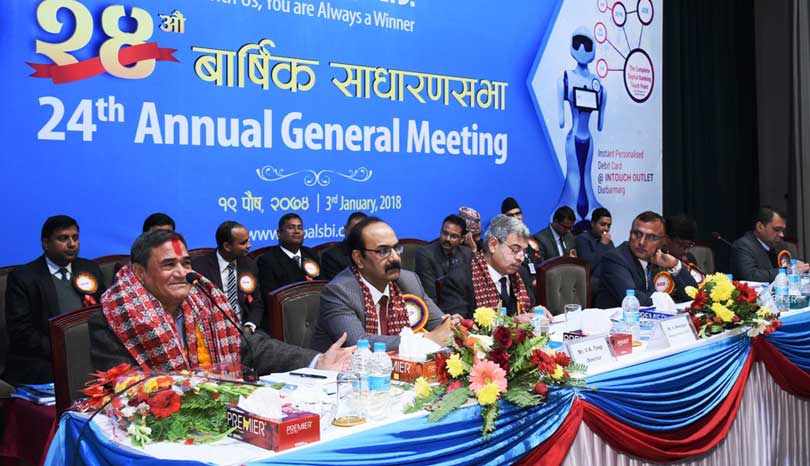 काठमाडौं । नेपाल एसबिआई बैंक लिमिटेडले २४औँ वार्षिक साधारणसभा पुस १९ गते त्रिभुवन आर्मी अफिसर्स क्लब, भद्रकाली काठमाडौंमा सम्पन्न गरेको छ । सो सभाले बैंकको आ.व. २०७३/७४ को संचालक समितिको प्रतिवेदन, वासलात, नाफा नोक्सान बाँडफाँड हिसाव लगायतका वार्षिक आर्थिक विवरण पारित गरेको छ ।