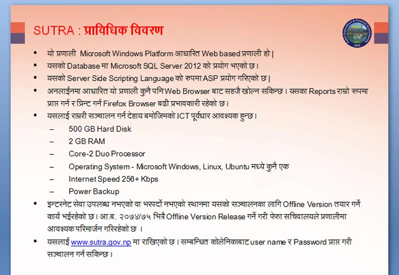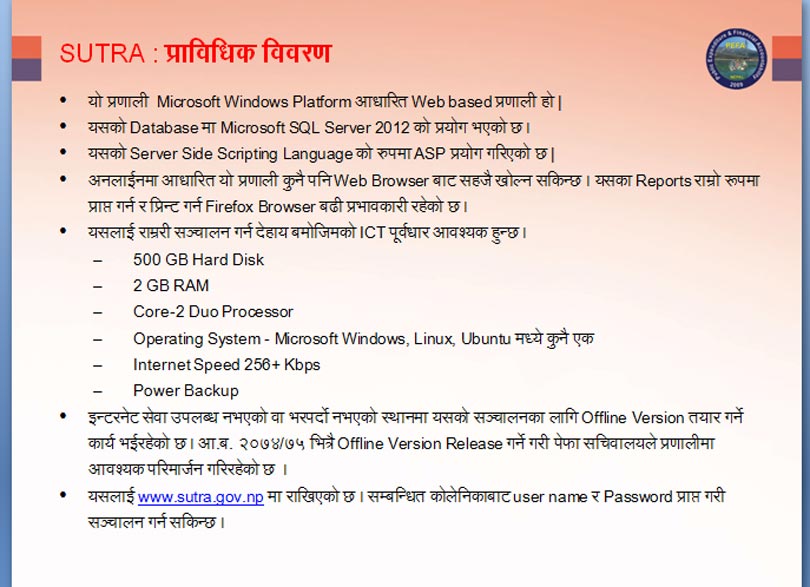 निरौलाका अनुसार यो प्रणाली माइक्रोसफ्ट विन्डोज प्लाटफर्ममा आधारित वेब बेस्ड प्रणाली हो । अनलाइनमा आधारित यो प्रणाली कुनै पनि वेब ब्राउजरबाट सहजै खोल्न सकिनेछ । तर यसका रिपोर्टस् राम्रो रुपमा प्राप्त गर्न र प्रिन्ट गर्न भने फायरफक्स ब्राउजर बढी प्रभावकारी रहेको छ ।
