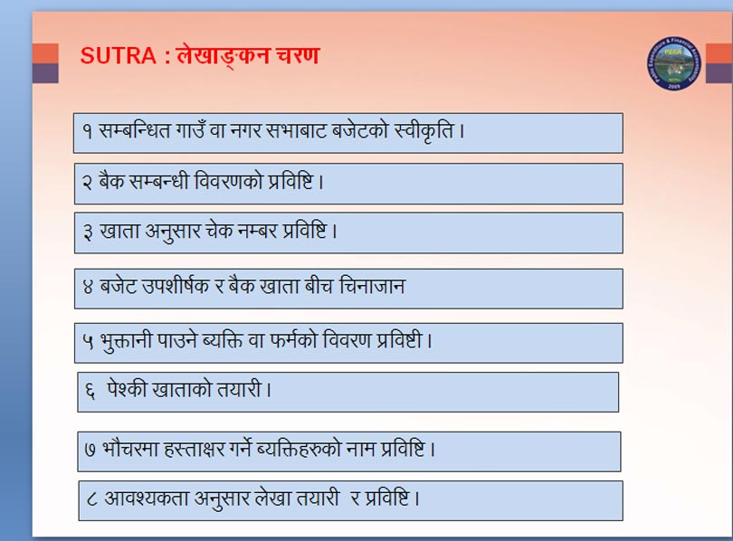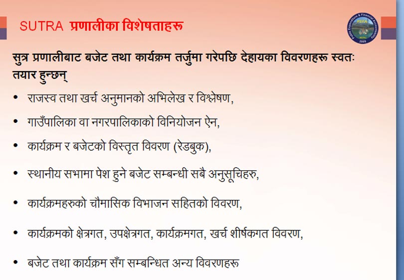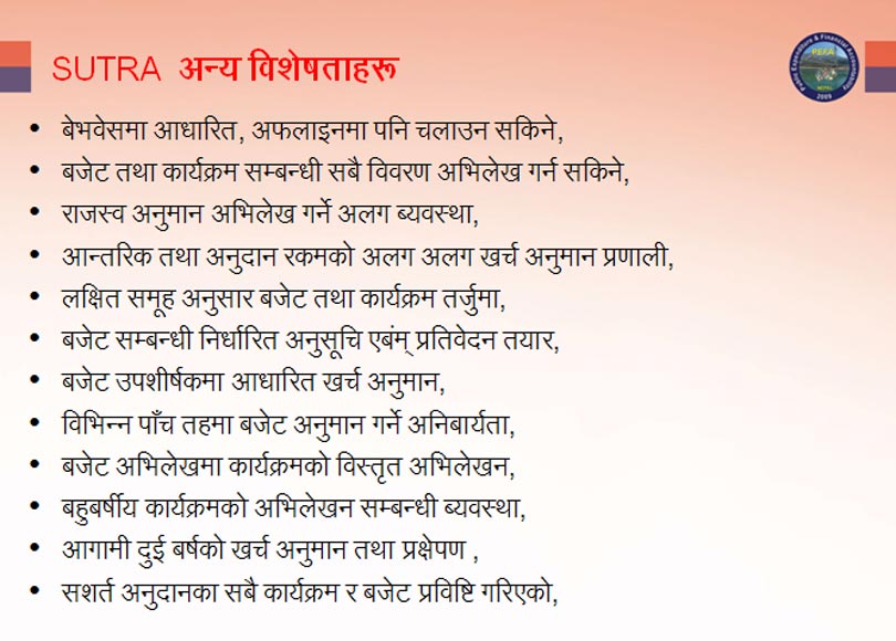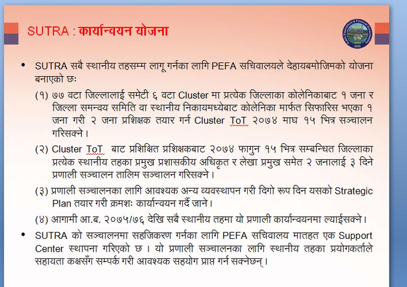 पेफा सचिबालयले स्थानीय सञ्चित कोष ब्यवस्थापन प्रणाली विकास गरेको हो । यसलाई अंग्रेजीको छोटकरीमा सुत्र नाम दिइएको छ । यो प्रणाली अर्थमन्त्रालयको बजेट तथा कार्यक्रमम महाशाखाको निर्देशनमा बनाइएको सचिबालयका सदस्य सचिब मुरारी निरौलाले जानकारी दिए । यो लेखा प्रणाली महालेखा नियन्त्रकको कार्यालय र संघीय मामिला तथा स्थानीय विकास मन्त्रालयसँगको सहकार्यमा बनाइएको हो ।