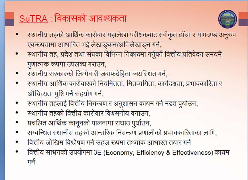 काठमाडौं । सार्बजनिक खर्च तथा वित्तीय उत्तरदायित्व (पेफा) सचिबालयले प्रदेश र स्थानीय तहको आम्दानी र खर्च प्रणालाई एकरुपता दिन सुत्र नामक सफ्टवयर लेखा प्रणालीको विकास गरेको छ ।