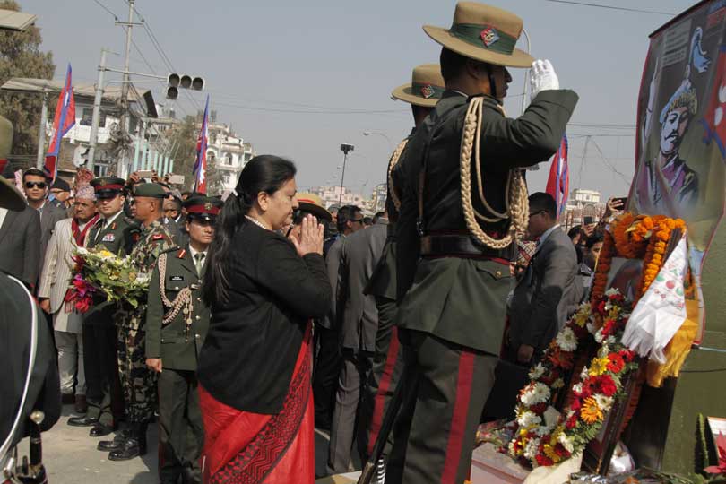 सो अवसरमा नेपाली सेनाको टोलीले राष्ट्रपति भण्डारीलाई सलामी गारद अर्पण गरेको थियो । विस २०६३ देखि पृथ्वी जयन्ती तथा राष्ट्रिय एकता दिवसमा सरकारले बिदा दिन कटौती गरे पनि यो वर्षदेखि सार्वजनिक बिदा दिन शुरु गरेपछि सो दिवस भव्यताका साथ मनाउन थालिएको हो ।