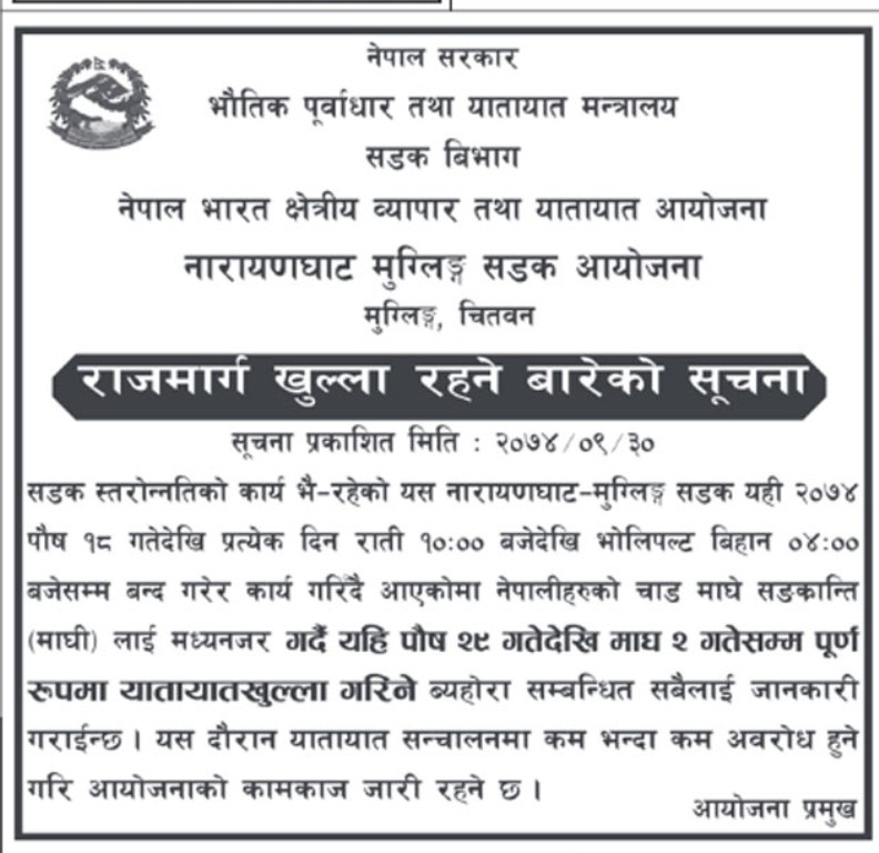 यसअघि यही पुस १८ गतेदेखि राति १० बजेदेखि बिहान ४ बजेसम्म आवागमन बन्द गरेर भित्तो काट्ने काम भइरहेको थियो । चितवनका ट्राफिक प्रहरी प्रमुख तथा प्रहरी निरीक्षक सन्तोष पन्तका अनुसार आजदेखि माघ २ गतेसम्म सडक खुला रहने छ ।