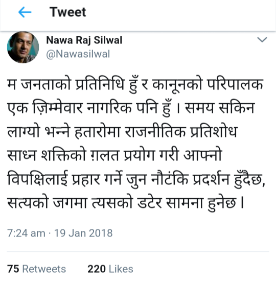 आज विहान उनले ट्वीटमा लेखेका छन ‘म जनताको प्रतिनिधि हुँ र कानूनको परिपालक एक जिम्मेवार नागरिक पनि हुँ । समय सकिन लाग्यो भन्ने हतारोमा राजनीतिक प्रतिशोध साध्न शक्तिको गलत प्रयोग गरी आफ्नो विपक्षीलाई प्रहार गर्ने जुन नौटंकी प्रदर्शन हुँदैछ, सत्यको जगमा त्यसको डटेर सामना हुनेछ ।’