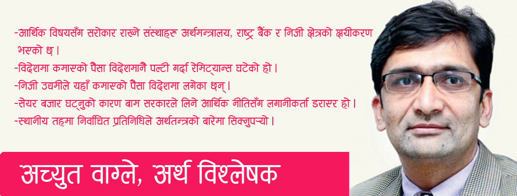 राजनीतिक र आर्थिक विषयमा तिखो टिप्पणी गर्ने अच्युत वाग्लेको विशेषता हो । विगतमा पत्रकारिता समेत गरेका वाग्लेले प्रधानमन्त्रीदेखि अख्तियार तथा केन्द्रीय बैंकमा समेत सल्लाहकारको भूमिकामा काम गरेका छन् । अर्थ राजनीतिको बारेमा जानकार वाग्लेसँग क्लिकमाण्डूका लागि आशीष ज्ञवालीले देशको पछिल्लो आर्थिक अवस्थाको बारेमा गरेको कुराकानी: