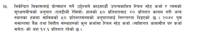 ‘विकेन्द्रित विकासलाई प्रोत्साहन गर्ने उद्देश्यले काठमाडौं उपत्यकाभित्र रियल स्टेट कर्जा र त्यसको सुरक्षणबीचको अनुपात (एलटीभी रेसियो) हालको ५० प्रतिशतबाट ४० प्रतिशत कायम गरी अन्य स्थानका हकमा साविकको ५० प्रतिशतसम्मको अनुपातलाई निरन्तरता दिइएको छ,’ राष्ट्र बैंकले मौद्रिक नीतिको मध्यावधी समीक्षा मार्फत गरिएको नीतिगत परिवर्तनमा उल्लेख गरिएको छ ।